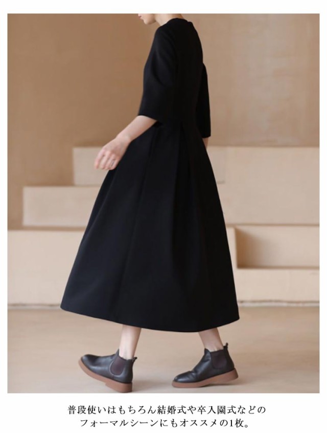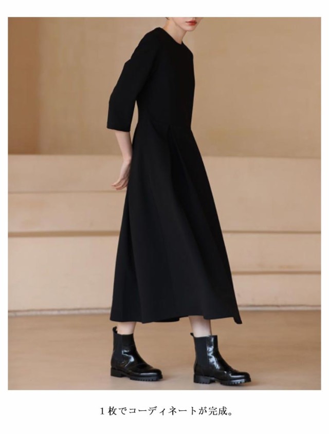 | 膝下丈の上品なブラックワンピース クールネックがデコルテ部分を綺麗に見せてくれます。 ウエストのタックフレアのデザインが、上品なフレアシルエットに仕上げ、大人フェミニンな印象に。 1枚でコーディネートが完成。 普段使いはもちろん結婚式や卒入園式などのフォーマルシーンにもオススメの1枚。 | |