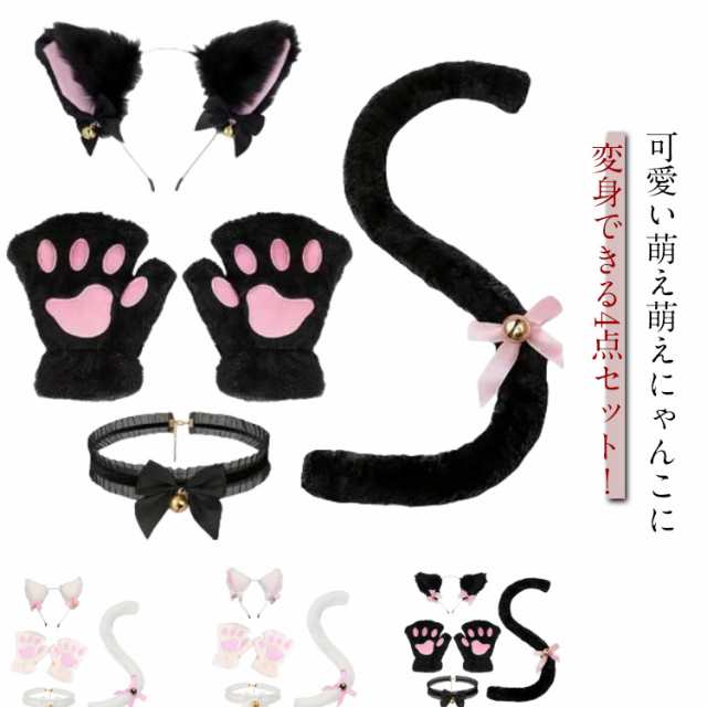 鈴付き 小物 にゃんこ 猫耳 カチューシャ 猫しっぽ 肉球手袋 チョーカー 仮装 グッズ コスプレ 猫耳 黒 白 4点セット 大人用 子供用 ねこ耳 可愛い コスチューム 文化祭 パーティー 黒 白