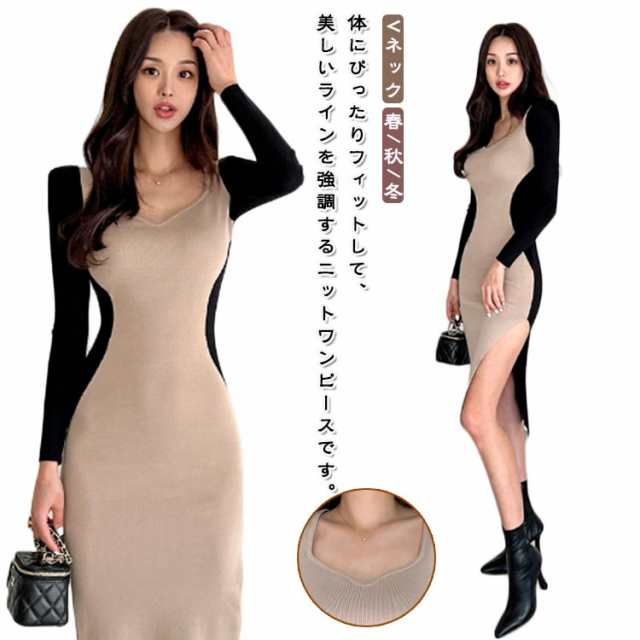 鎖骨 ニットワンピース 大人 デコルテ Vネック 切り替え 長袖 タイト 細身 リブニット タイト ニットワンピ 配色ワンピース スリム 上品 レディース ワンピ パーティドレス サイドスリット 綺麗め 細身 シンプル