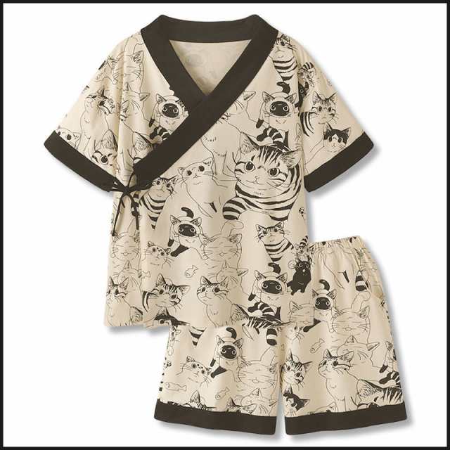 送料無料 甚平 レディース 女性用 じんべい かわいい ルームウェア サマー パジャマ 男女兼用 花火大会 夏祭り 七夕 じんべい かわいい ねこ柄