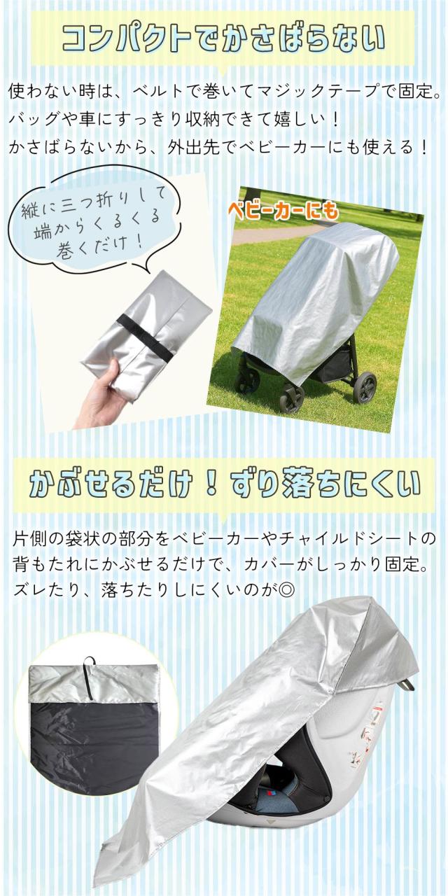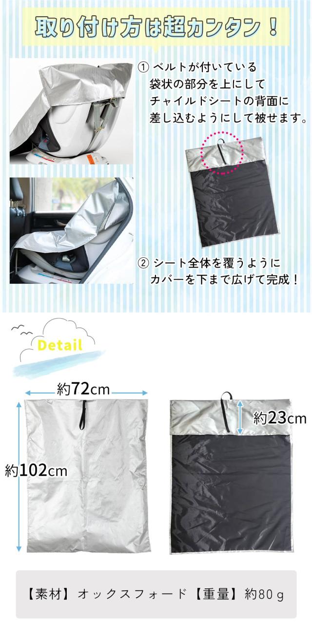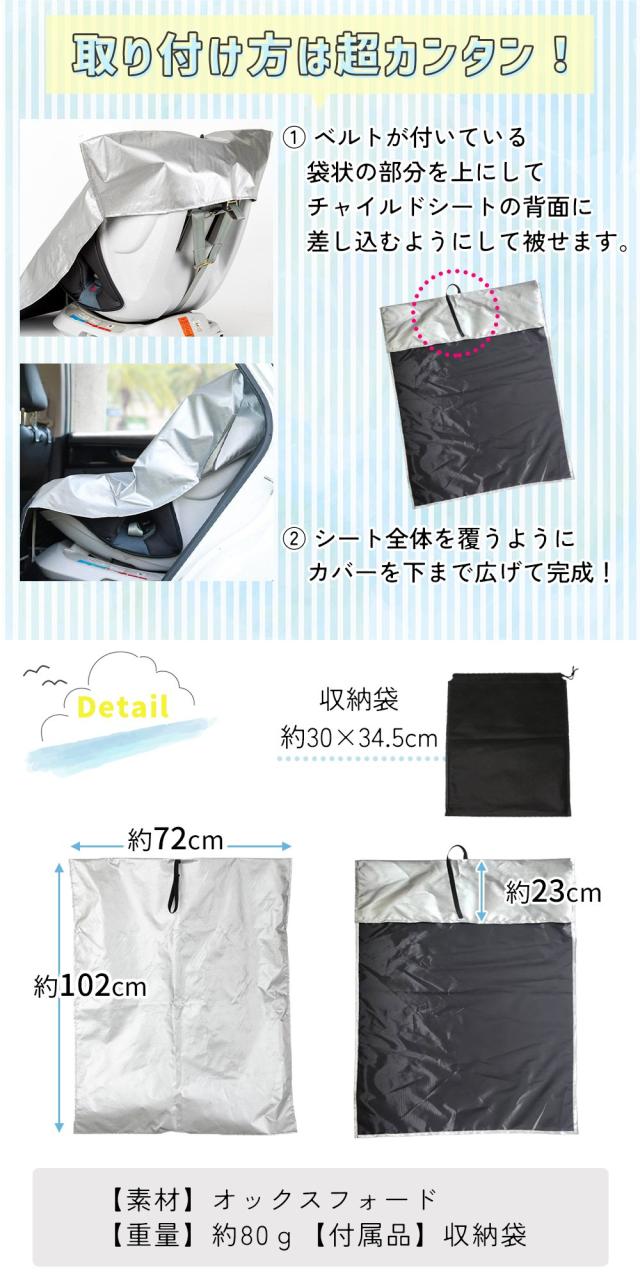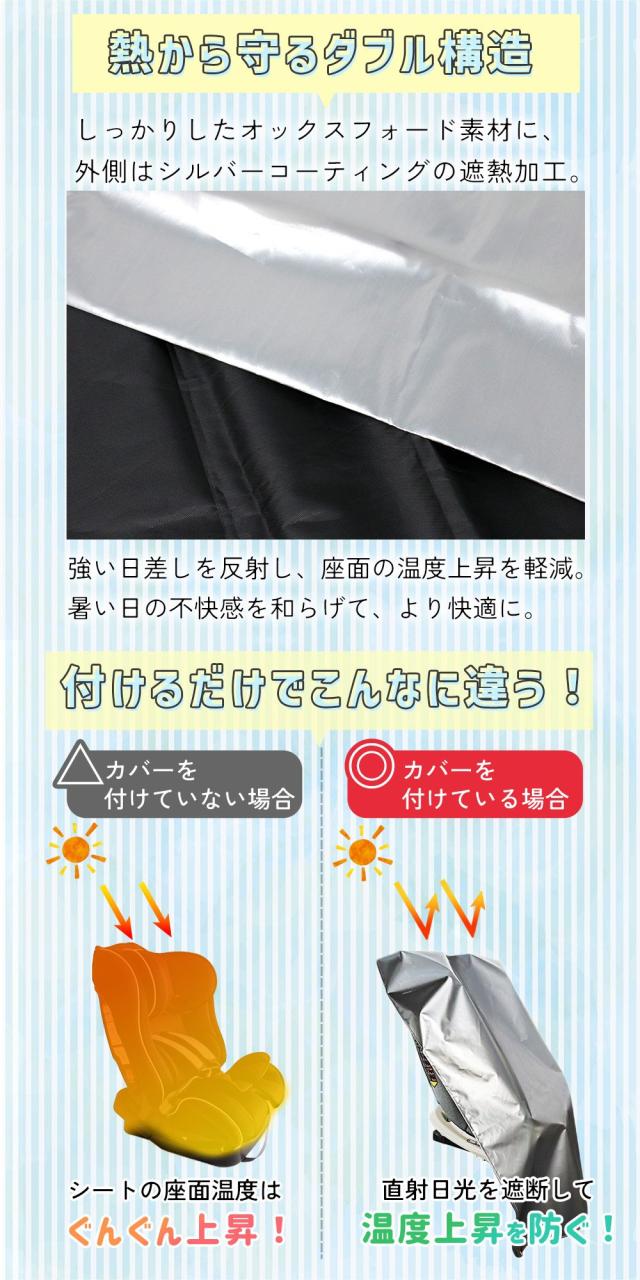 チャイルドシートカバー/遮熱カバー/日除け/アルミカバー/劣化防止/チャイルドシート/汚れ/ゴミ/ほこり/保護/防熱/コンパクト/折りたたみ/紫外線/太陽熱/高温/火傷/やけど/防ぐ/変色/暑さ/車/新生児/赤ちゃん/ベビー/子供/プロテクター/被せるだけ/車/簡単取り付け/二重構造/アルミフィルム/ズレ防止/安全対策