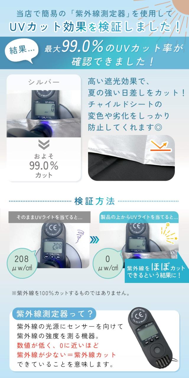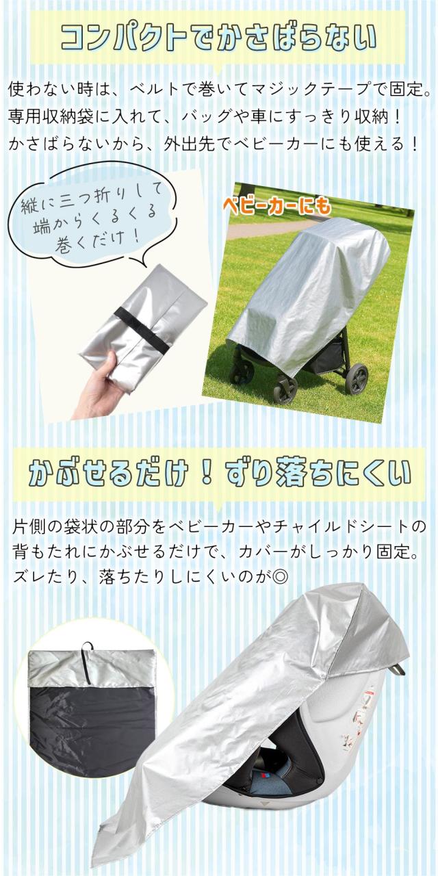 二重構造のアルミフィルムを採用し、強い太陽熱や紫外線からチャイルドシートをしっかり遮断。