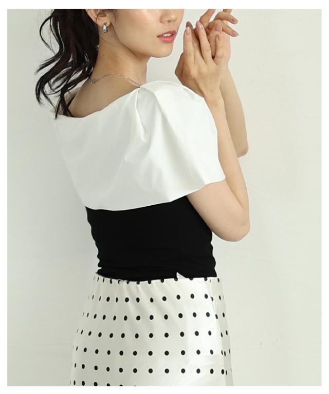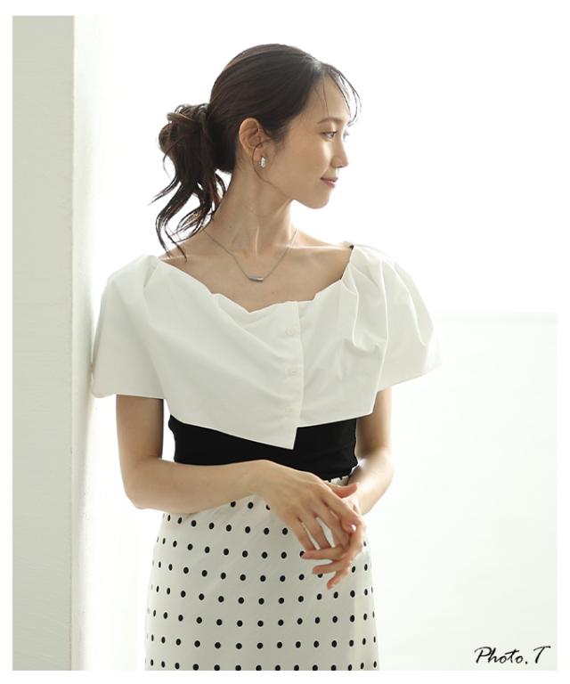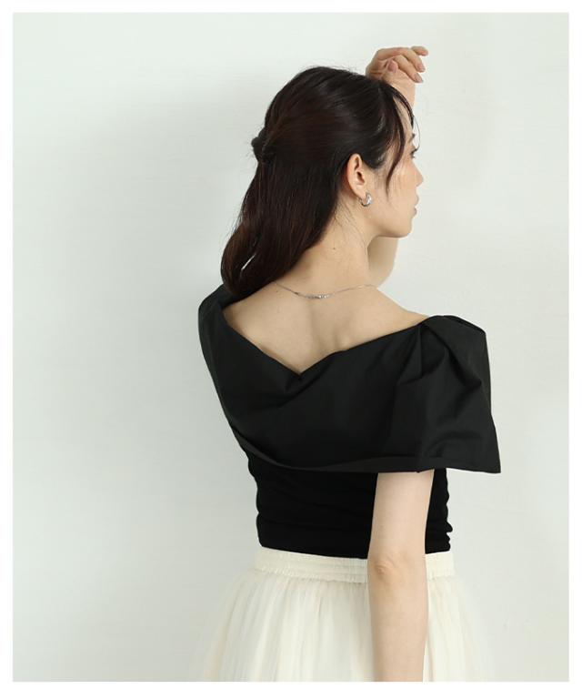 特徴: ケープ オフショルダー風 ボタン アシンメトリー リブカットソー タック 異素材