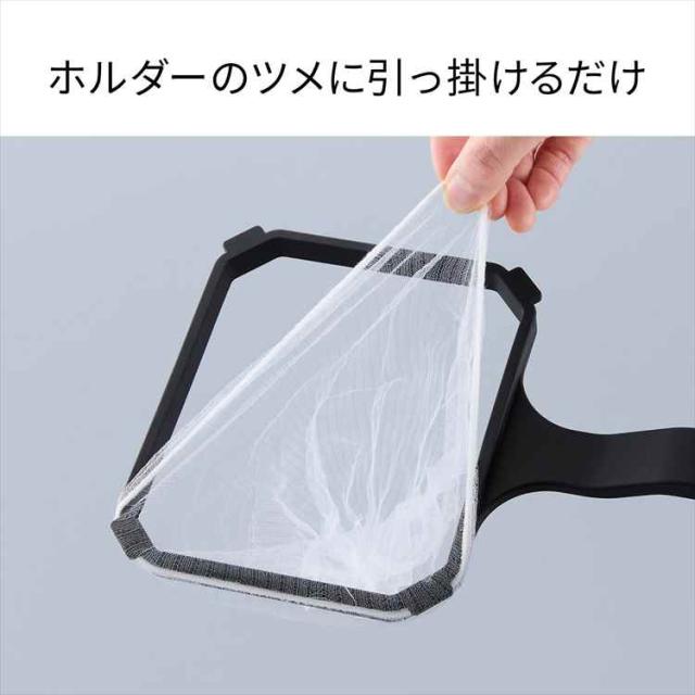 ホルダーの四隅にあるツメに水切りネットを掛けるだけ。取り付け・交換が簡単です。
