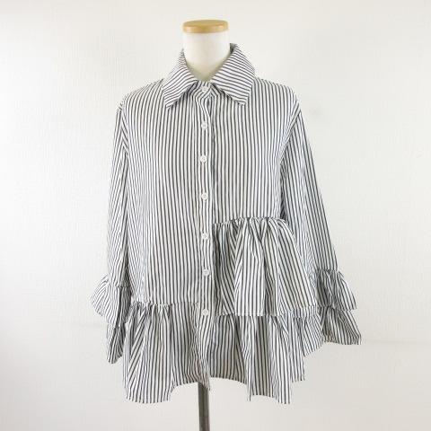 【中古】未使用品 コンテ Con te ストライプシャツ フリル ブラウス 長袖 黒 白 *A562 レディース