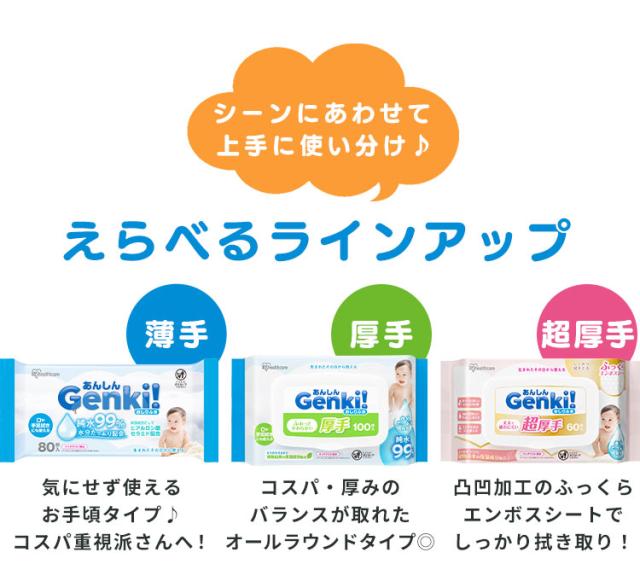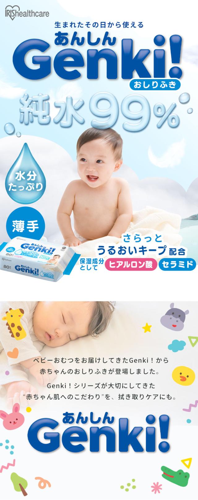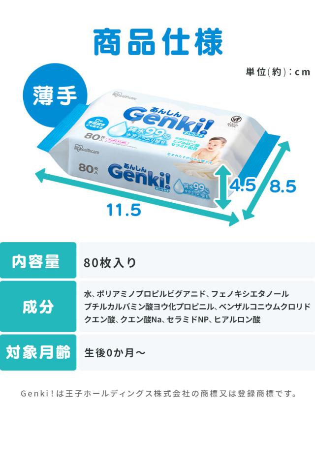 (検索用:おしりふき・薄手・80枚入・純水99%・水分たっぷり・無香料・ノンアルコール・保湿成分配合・赤ちゃん・ベビー・持ち運び・おでかけ・手口ふき・ウェットティッシュ・おしり拭き・お尻拭き・Genki・ふつうサイズ・4967576792189・アイリスオーヤマ)