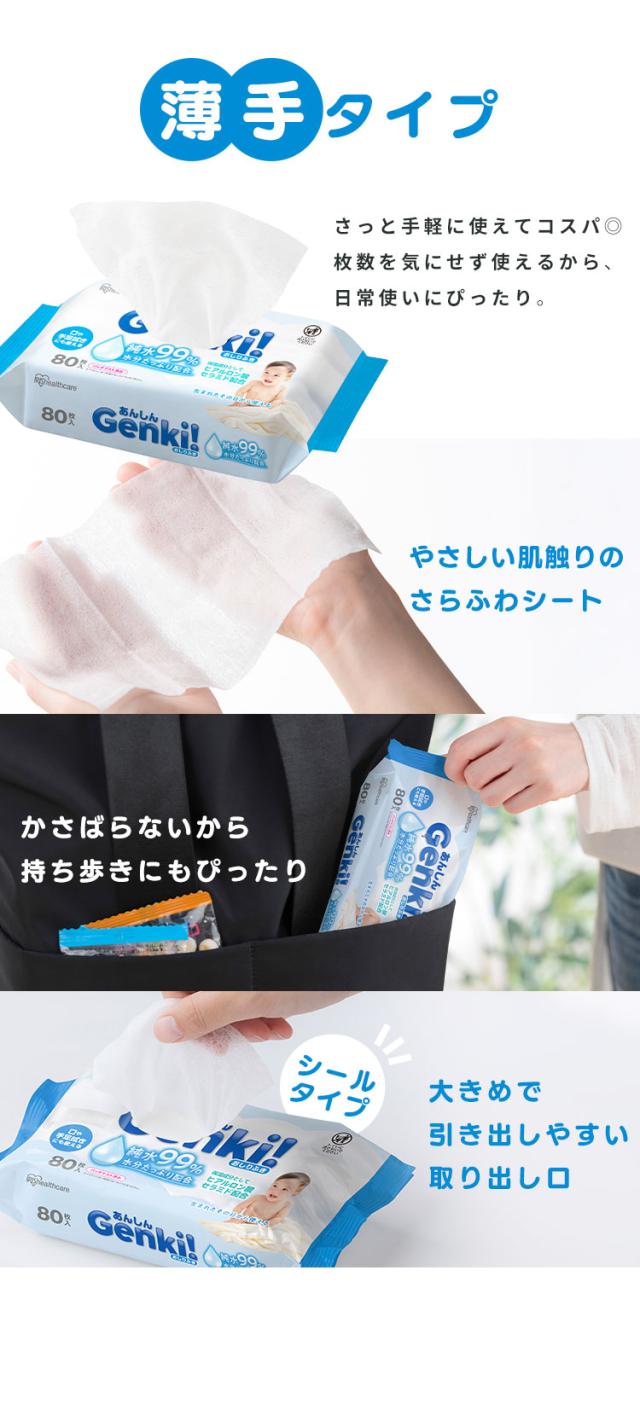 おしりふき 薄手 80枚入 純水99% 水分たっぷり 無香料 ノンアルコール 保湿成分配合 赤ちゃん ベビー 持ち運び おでかけ 携帯 手口ふき ウェットティッシュ おしり拭き お尻拭き 手口拭きシート Genki アイリスオーヤマ ふつうサイズ GOK-801N *