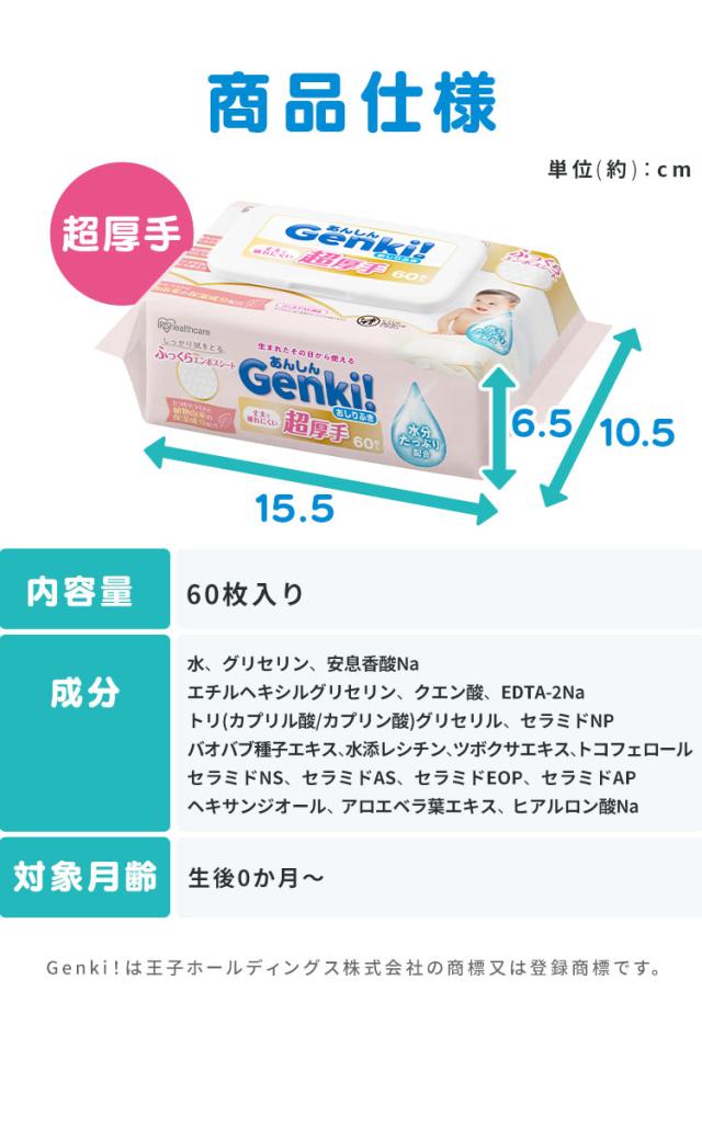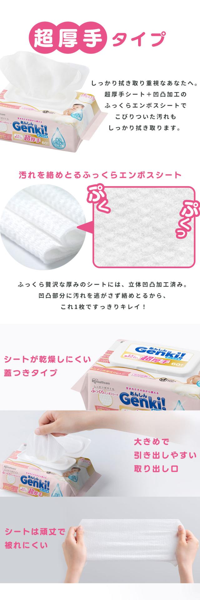 (検索用:おしりふき・超厚手・大判・60枚入・ふた付・純水99%・水分たっぷり・無香料・ノンアルコール・保湿成分配合・ふっくらエンボスシート・丈夫・赤ちゃん・ベビー・手口ふき・ウェットティッシュ・Genki・4967576792202・アイリスオーヤマ)