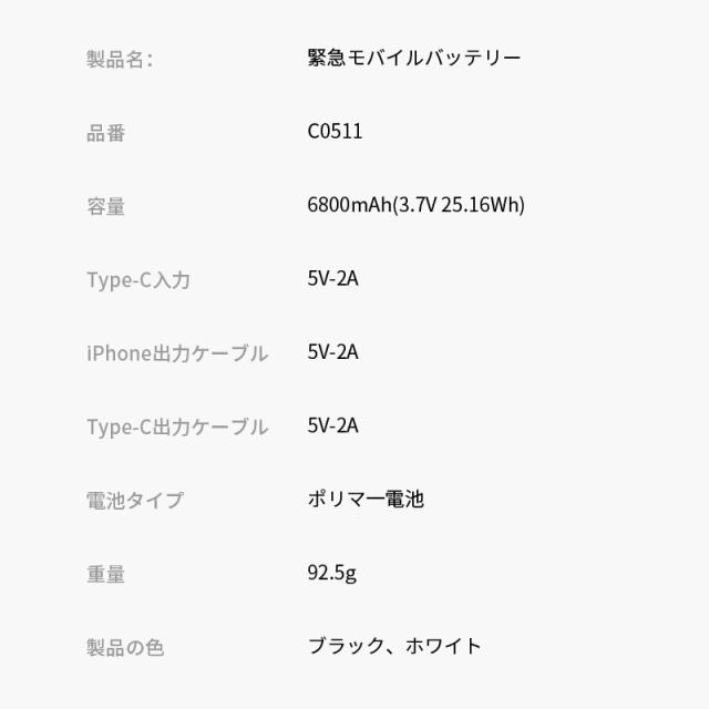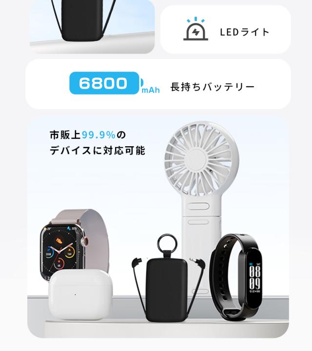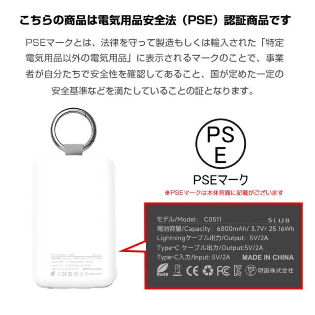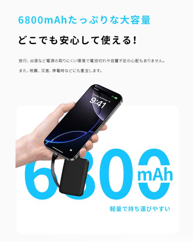 モバイルバッテリー 6800mAh大容量 iPhone/Type-Cケーブル内蔵 軽量 二台同時充電 LEDライト付き SOS信号 カラビナ付き キーリング付き Android/iOS対応 急速充電 iPhone17/16/15充電 極小 残電量表示 便利グッズ 防災電源 90日安心保証付き【PL保険加入済み製品・安心】