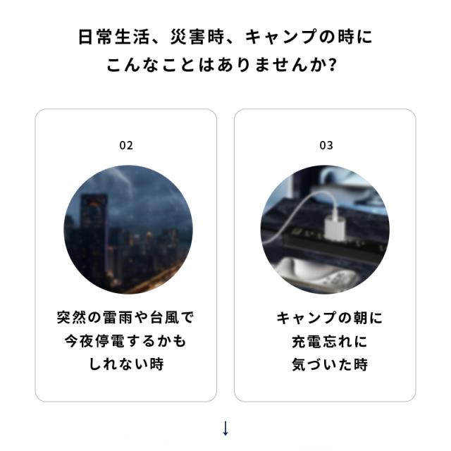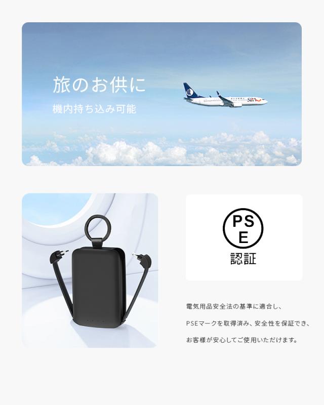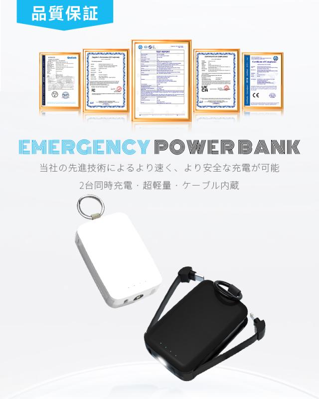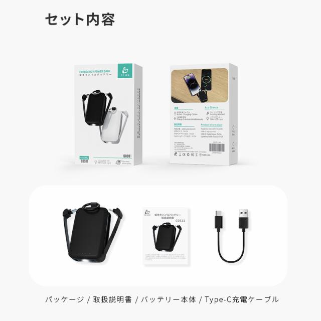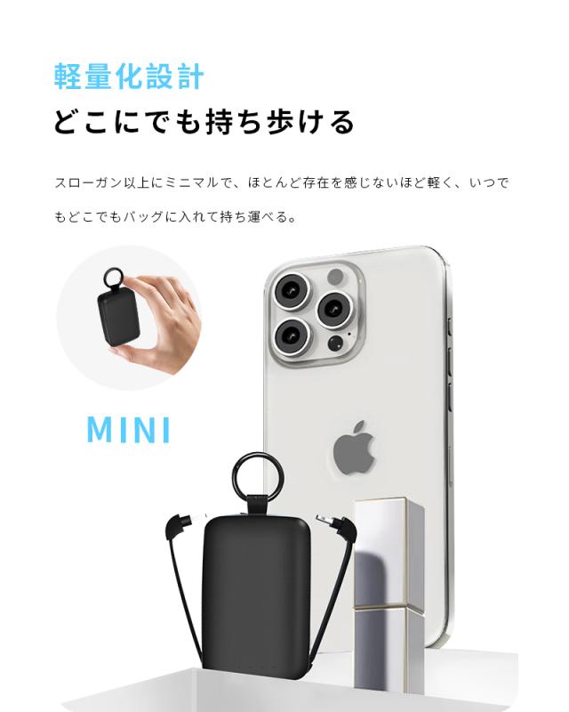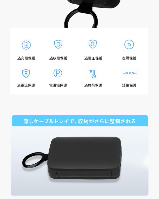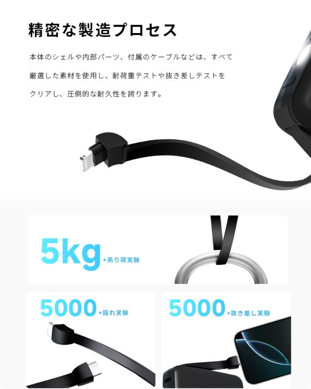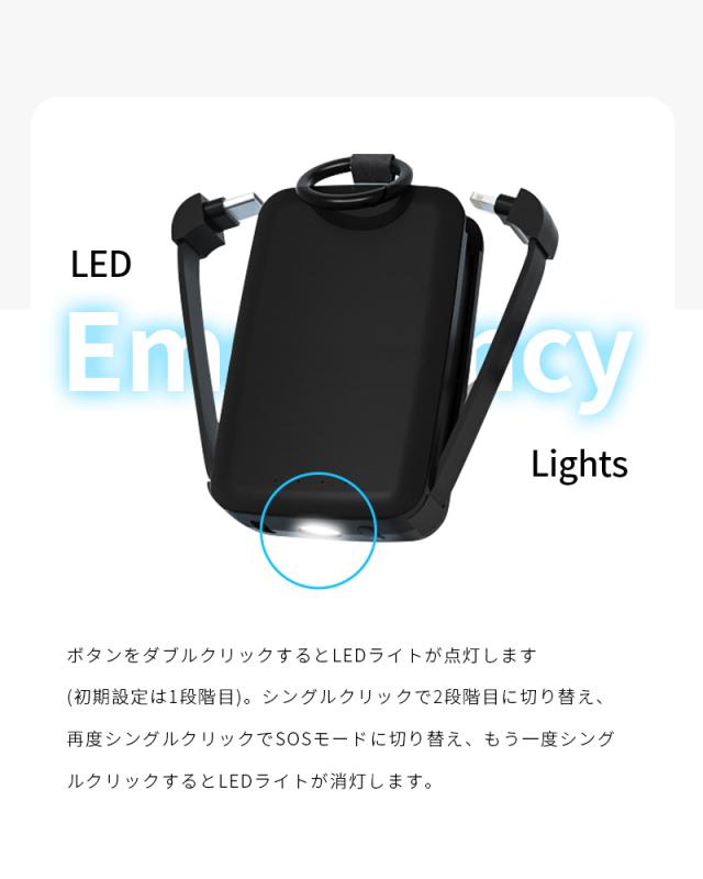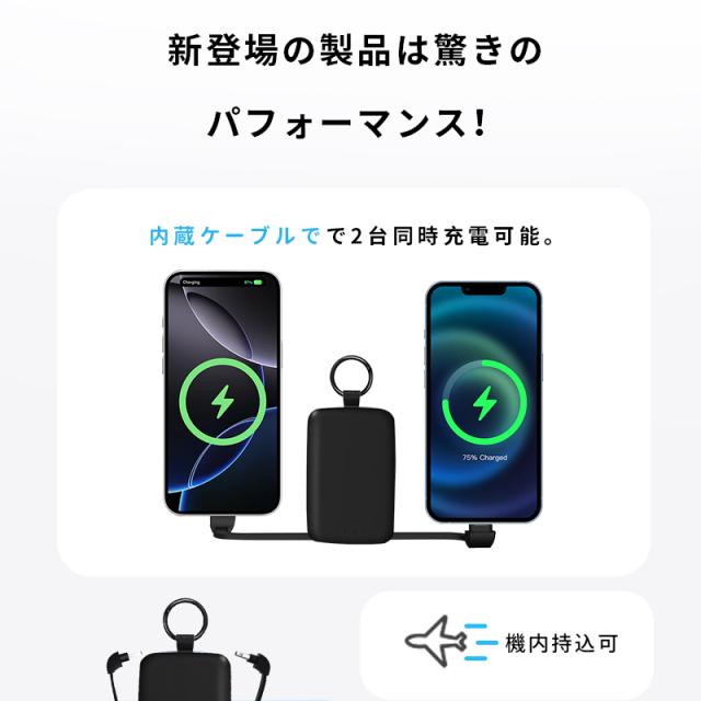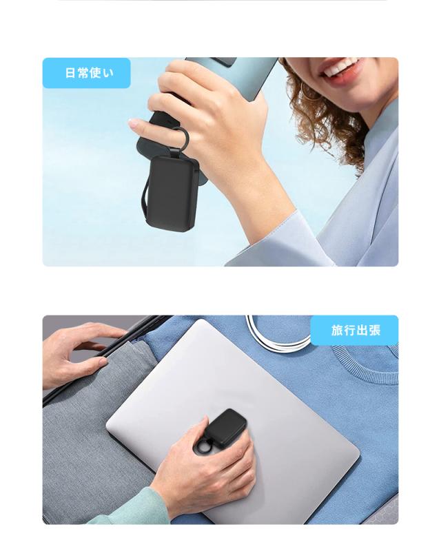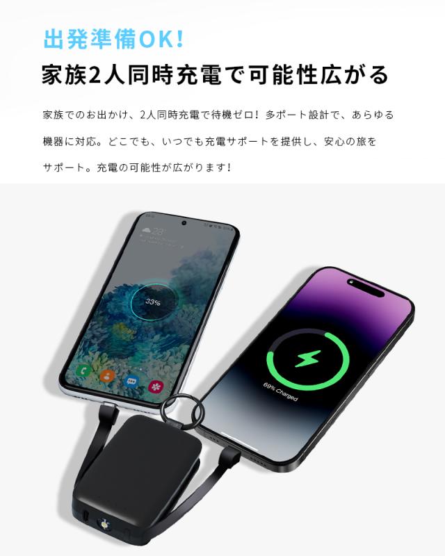 本製品はTYPE-CとiPhoneの2種類の充電ケーブルを内蔵しており、AndroidやApple製品を問わず、2台のデバイスへの同時充電をサポートし、外出先でも素早く電力補給ができ、予備ケーブルを持ち歩く必要がありません。
