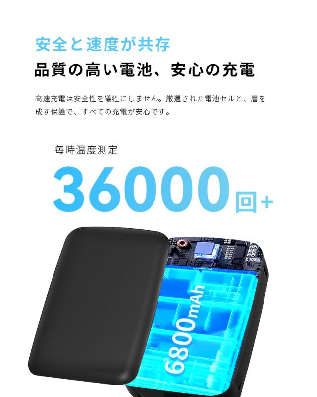 6800mAhという大容量バッテリーを搭載しながら、急速充電技術を採用しています。5V/2Aの充電規格に対応し、短時間での充電を可能にしました。充電サイクルによる劣化を抑制し、高いエネルギー変換効率を実現し、無駄な電力消費を徹底的に排除しています。