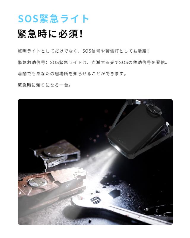 LEDライト内蔵、暗所での使用やアウトドアシーンでの利便性を大幅に向上させました。SOS緊急モードも搭載、ボタン長押しで即時作動し、国際標準SOS信号を発信。視認性の高い高輝度点滅で、遠距離からの救助要請を可能になります。
