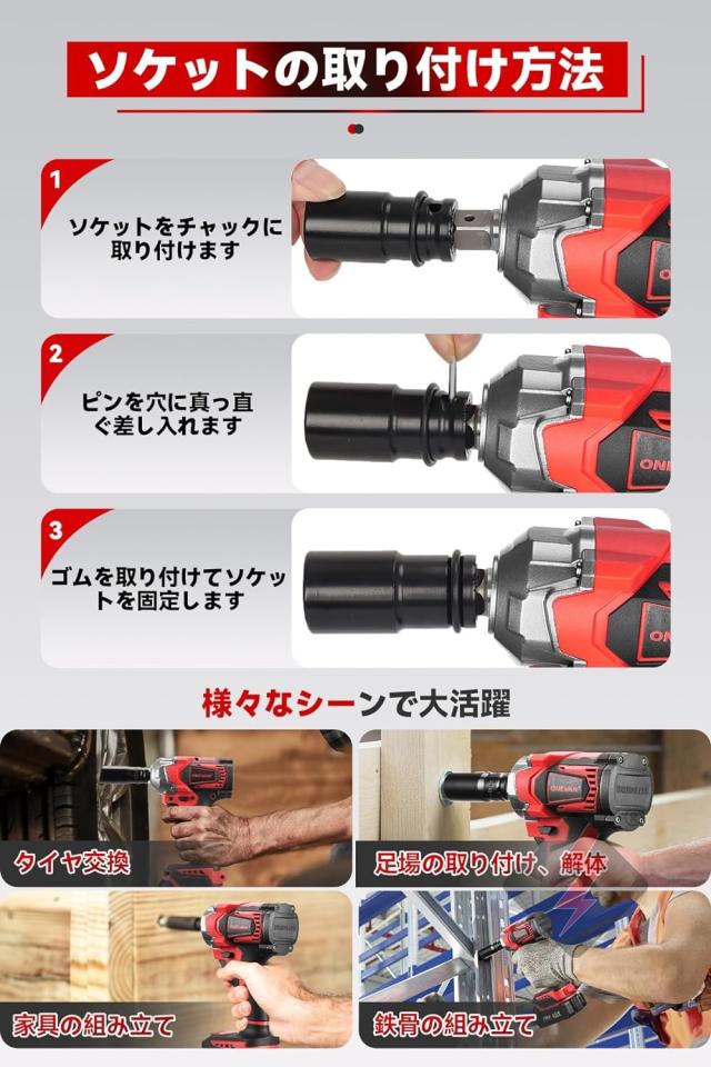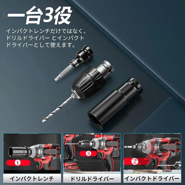 ドライバーアダプターとアクセサリーが付属ため、自動車の修理、タイヤ交換用のインパクトレンチだけではなく、ドリルドライバー とインパクトドライバーとして使えます。ホームメンテナンス、およびナットの締め付けとボルトの緩みに最適です。