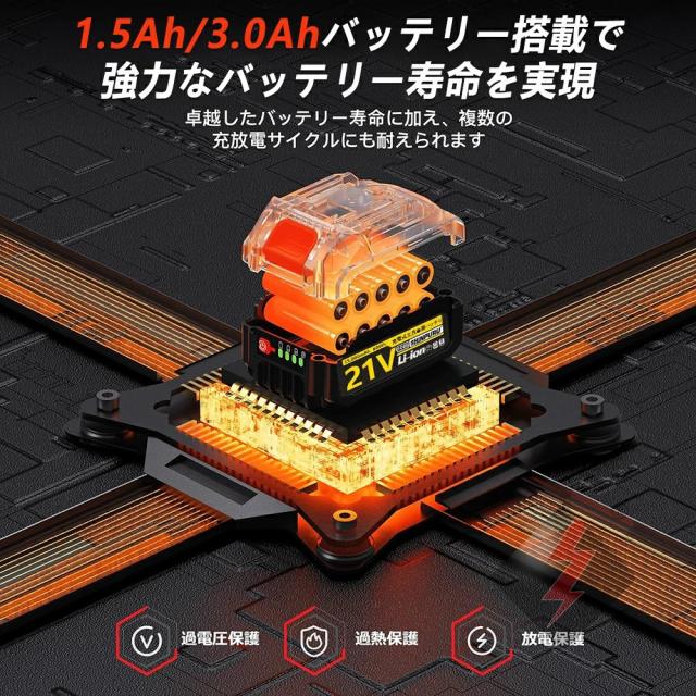 ブラシレスモータを採用で、より強力で長寿命、より速い冷却、より高い効率を実現しています。その上、バッテリーにも過温度保護や短絡保護など、様々な自保護機能がついていて、 安全で耐久性もあります。
