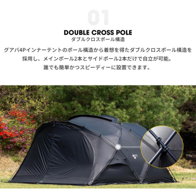 Gの安定した構造はそのままに、幅と高さを拡張し、より広がりのあるアウトドアシェルターへと生まれ変わりました。