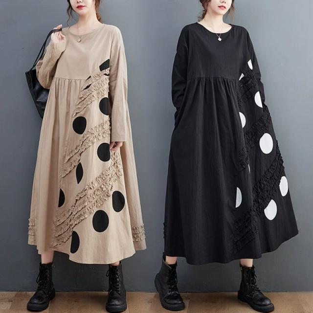 ワンピース プリーツ 長袖 フレア レディース トップス ワンピース モード 装飾 レトロ ドット pLegLad店 モード系 大人 個性的 ゆったり 体型カバー ロングシャツ ロングワンピ