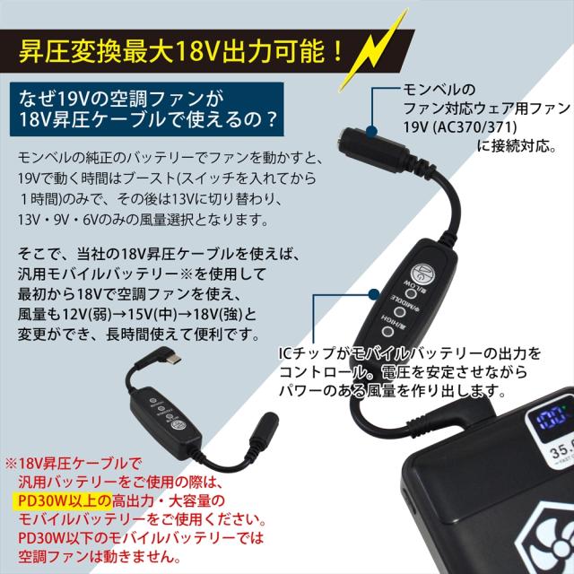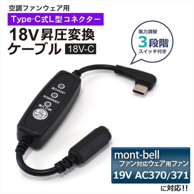 mont-bell モンベル Type-C昇圧 アダプター AC370 371 ファン 対応 空調ウェア 19V AC370/371 対応 PD対応 18V L型 Type-C モバイルバッテリー ファン付き作業服 変換 昇圧アダプタ 昇圧ケーブル USB-C端子 タイプC 昇圧コンバータ 風量調整 三段階 スイッチ付き 【18V-C】