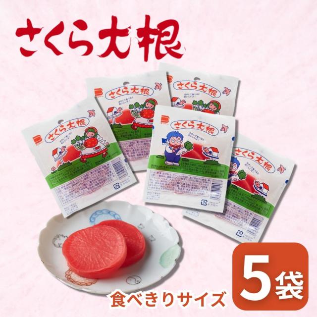 | 主な仕様 | 本当の大根を”甘酢漬”に調味し包装した駄菓子です。 「 さくら大根 2枚1組×5セット 計10枚」地方の駄菓子屋さんの定番商品でさくら色した酢漬けのカリカリ大根です。 パリッとした”食感”と”酸味”のきいた味でクセになるお味です。 冷やして食べてもおいしいです。手軽に塩分補給ができるので夏バテ対策、熱中症対策としてもオススメです。 駄菓子の定番商品として数多くの著書やテレビ等にも紹介されております。 |