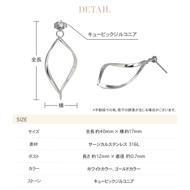 《 商品詳細 》●サイズ縦:約40mm/横:約17mm●ポスト長さ:約12mm 直径:約0.7mm●地金/素材素材: ステンレス316L石:キュービックジルコニア