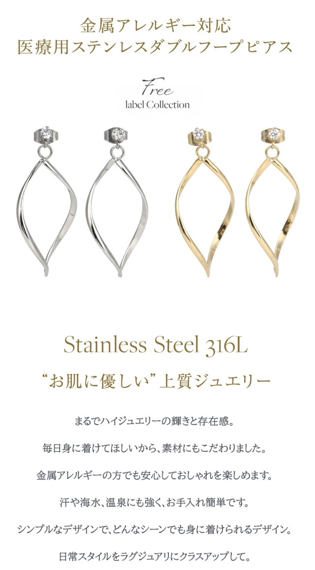 | サージカルステンレス 「 ステンレス316L 」は、汗などに接触しても金属が溶け出しにくく、アレルギー反応を起こしにくい、「 金属アレルギー対応 」の肌に優しい素材です。インプラントなどの医療現場でも使われている素材です。ステンレスには必ず番号がありますので「 Stainless steel 316L 」など、番号が明記されている商品のご購入をおすすめします。 ”錆びにくく変色も少ない”ため、汗をかいてもかぶれない、かゆくならないことが多く、スポーツや「 つけっぱなし 」にされたい方にも人気で女性だけでなく男性にもおすすめです。" ノンアレルギー "対応の「 アレルギーフリーピアス 」として、ジュエリースタジオ プラスターの【 フリーレーベルコレクション 】が好評を得ています。 ※こちらの商品は、医療用の器具に使用しているステンレスと同じ素材のステンレスになりますが、医療器具ではありません。アレルギー反応には個人差がございますので、全ての方に適合するものではありません。 |