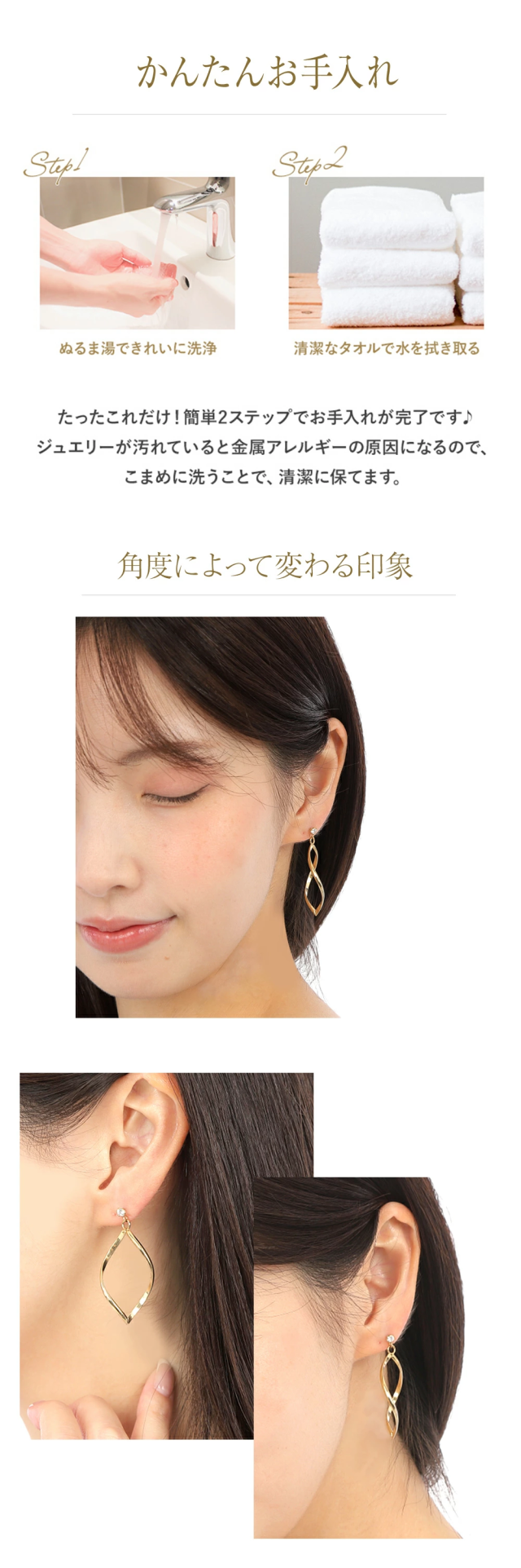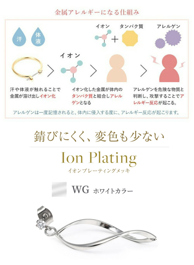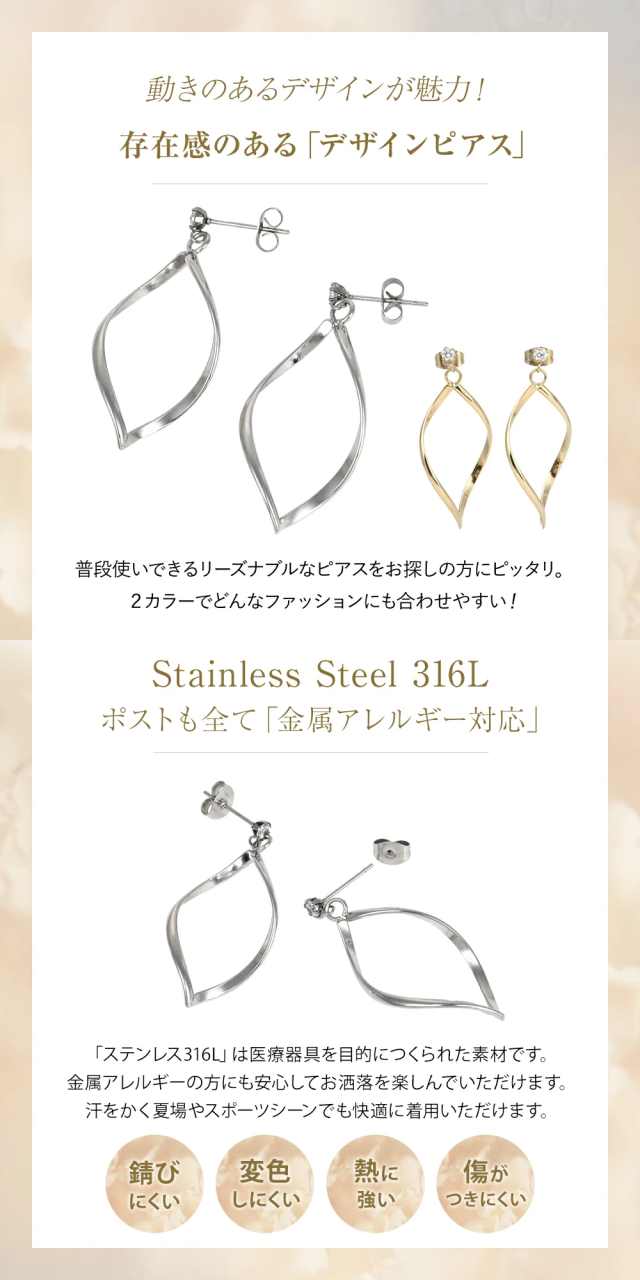 「 ステンレス 316L 」は、”錆びにくく変色も少ない”という特徴があります。そのため、汗などに接触しても金属が溶け出しにくく、アレルギー反応を起こしにくいので、近年金属アレルギー対応のジュエリー素材として使用されています。アレルギーの方でも安心・安全にオシャレを楽しんでいただきたいからこそ、素材にこだわりました。