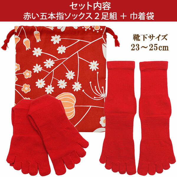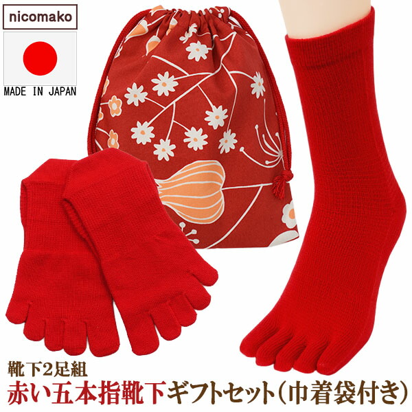 靴下 レディース 日本製 赤 ギフトセット 五本指 5本指 ソックス 巾着袋付き 表糸綿100% 赤い くつ下 2足組 23〜25cm 快適フィット クルー ギフト セット set1238 nicomako ニコマコ ネコポス便は送料無料 還暦祝い 女性 婦人 足 母 プレゼント 赤色 qw507