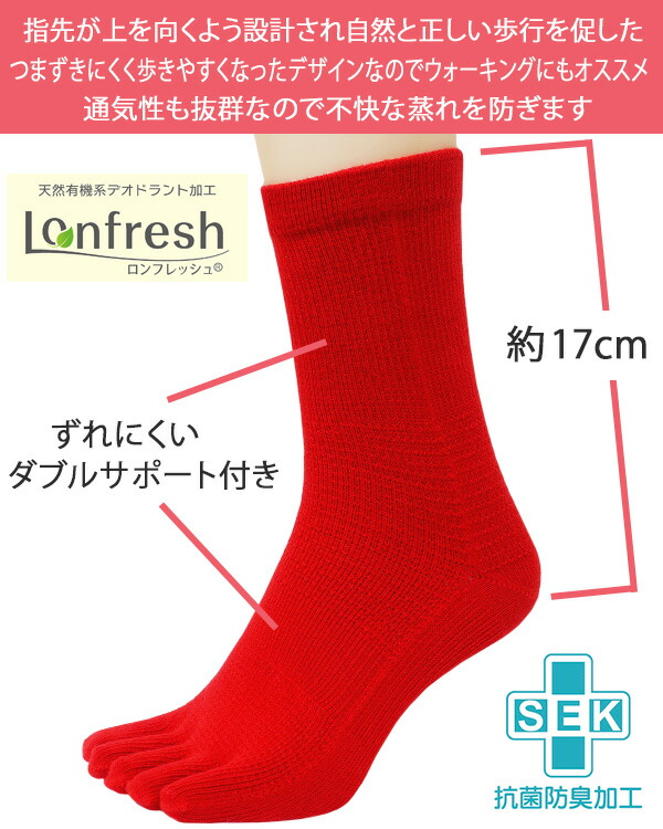 | ソックス | ※シンプルなデザインの表糸綿100%でコーマ綿仕様なので足にやさしい 程よいフィット感のある日本製5本指クルー丈ソックス/赤くつ下2足セット♪ ※指先が上を向くよう設計され自然と正しい歩行を促し、つまずきにくく歩きやすくなったデザインなのでウォーキングにもオススメ!通気性も抜群なので不快な蒸れを防ぎます。 ※ロンフレッシュ(天然有機系デオドラント加工)仕様!程よい厚さ生地で、履き心地・肌触り◎! |