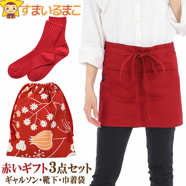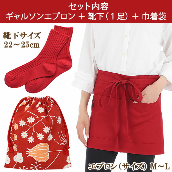 靴下 ギャルソン エプロン 巾着袋 ギフトセット レディース 赤 赤い くつ下 3点セット M〜L 22〜25cm 赤 set1446 メール便は送料無料 還暦祝い 女性 前掛けエプロン 前掛け 前結び 足にやさしい クルーソックス くつした ソックス セット 足 母 婦人 プレゼント 赤色