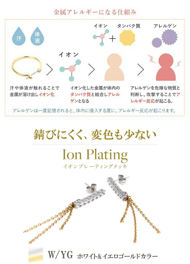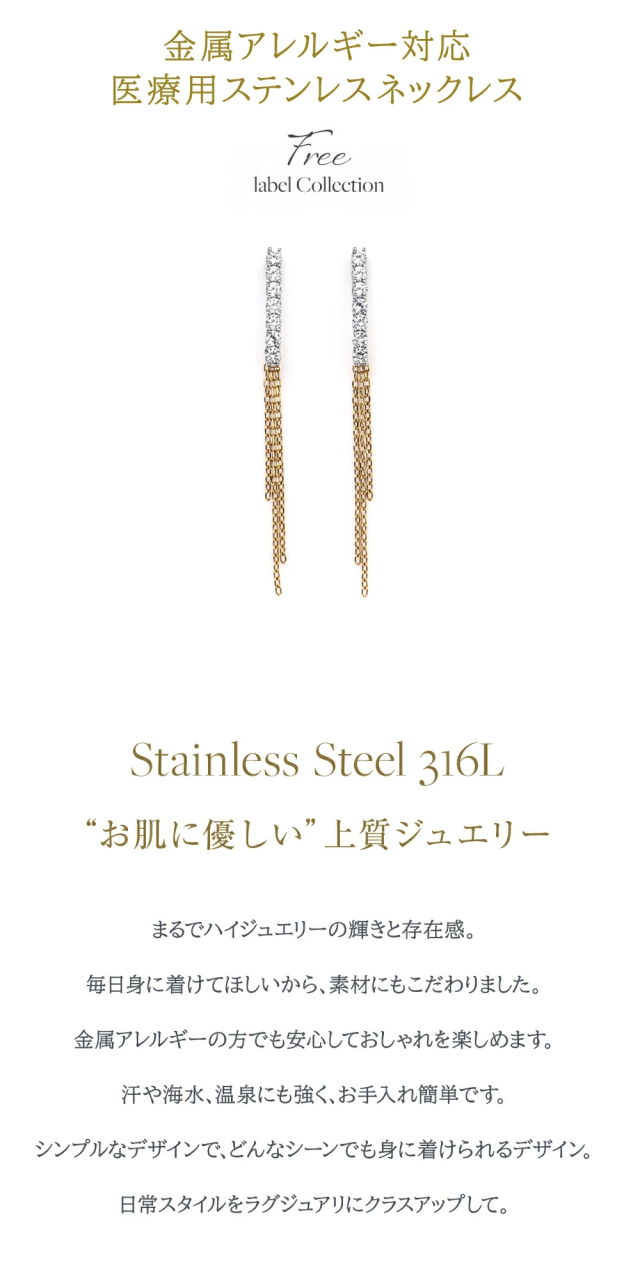 「 ステンレス 316L 」は、”錆びにくく変色も少ない”という特徴があります。そのため、汗などに接触しても金属が溶け出しにくく、アレルギー反応を起こしにくいので、近年金属アレルギー対応のジュエリー素材として使用されています。アレルギーの方でも安心・安全にオシャレを楽しんでいただきたいからこそ、素材にこだわりました。