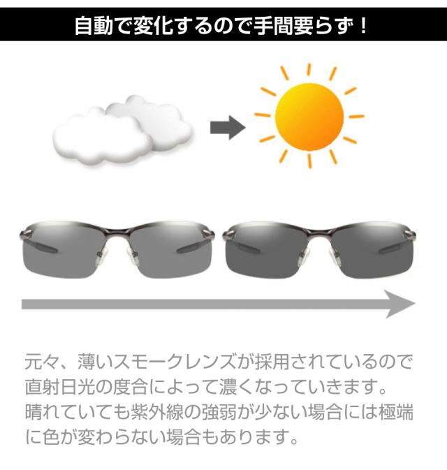 紫外線の量によってレンズの濃さが変わるサングラス 調光 紫外線カット 目の保護 目に優しい メンズ 屋外 室内