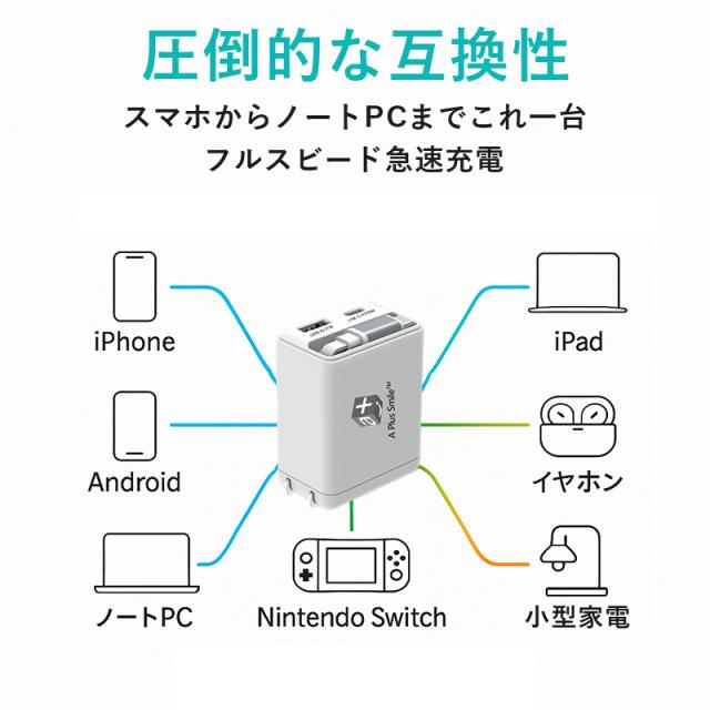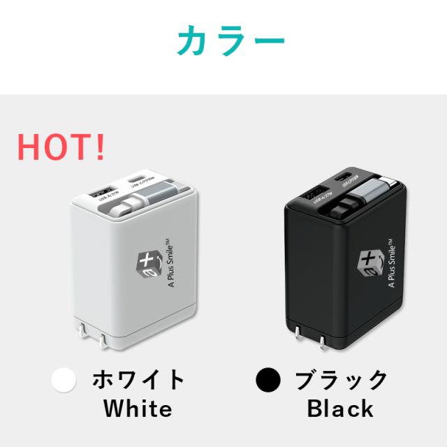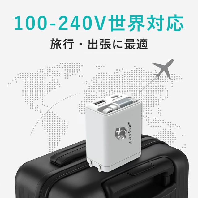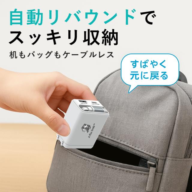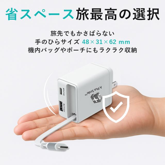 プラグ部分は本体に収納できる折りたたみ式で、突起がなく、コンパクトにまとめられます。手のひらサイズのため、バッグやスーツのポケットにすっきり収納可能。旅行や出張、通勤など幅広いシーンで活躍します。