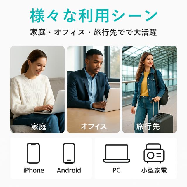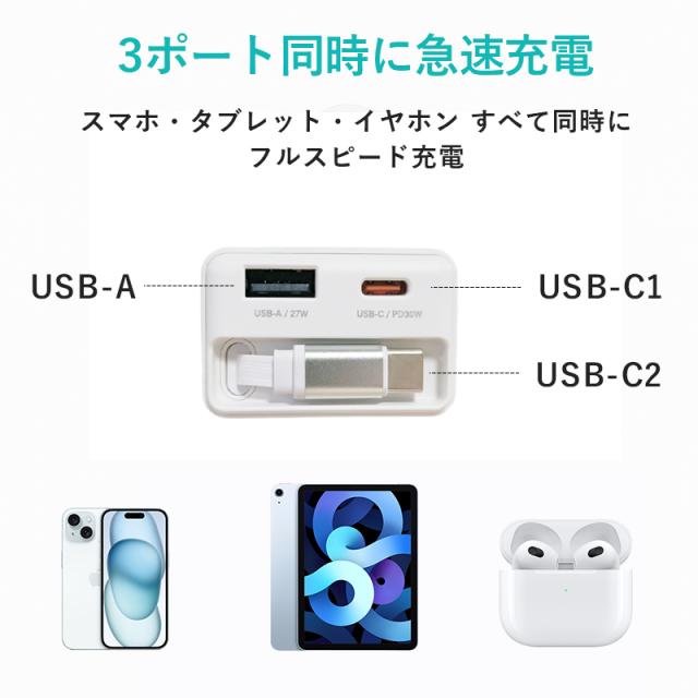 USB?C×2、USB?A×1の計3ポートを搭載。接続したデバイスを自動で識別し、それぞれに最適な電流を自動調整します。スマートフォンやタブレット、イヤホンを同時に充電しても速度が落ちにくく、家族や複数端末を利用する方でも安心です。