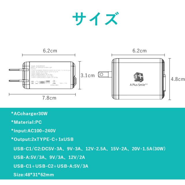 出力: USB-C1/C2:DC5V-3A、9V-3A、12V- 2.5A、15V-2A、20V-1.5A(30W)