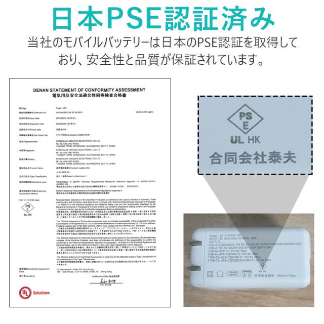 過電流・過電圧・過熱・ショート(短絡)など、計8種類の保護回路を搭載。万一電源が不安定になった場合でも、自動で出力を遮断し、大切なデバイスや充電器本体を守ります。日本国内の安全基準(PSE認証)も取得済みです。