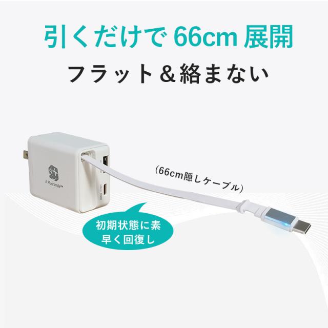 約66cmのPD対応ケーブルを内蔵。使用時に必要な長さまで伸ばし、使用後はワンタッチで簡単に巻き取れます。デスクやバッグの中でケーブルが絡まることなく、断線リスクも低減されます。