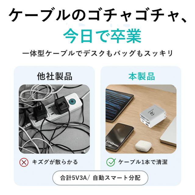 - ケーブル一体型の充電器が欲しく、探していたところ気に入る商品にめぐりあえました。差し込みも収納出来てコンパクトに収まり旅行の時に使いたいと思います。注文して翌日には届きました。早い対応ありがとうござい...