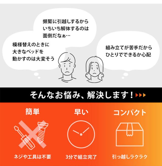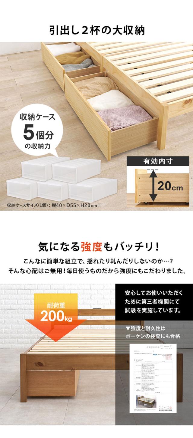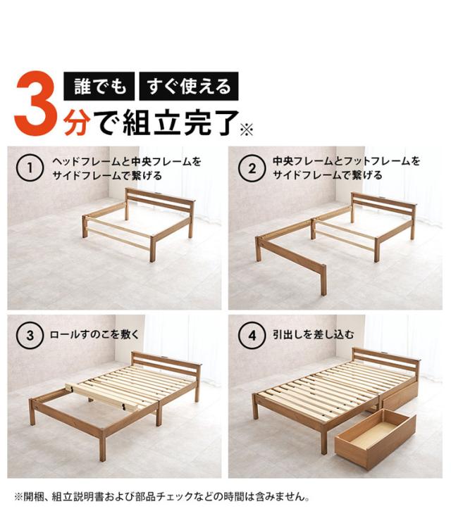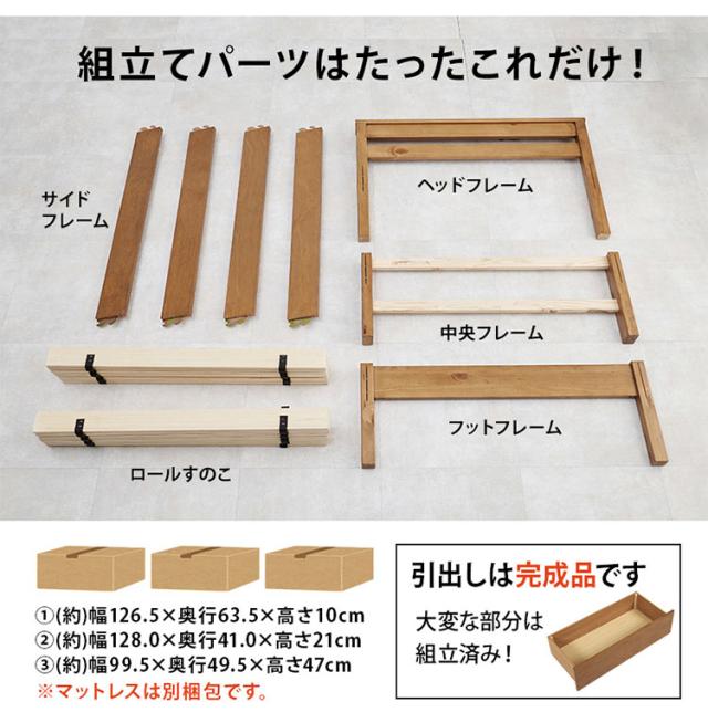 ネジなし、工具不要で簡単組立。模様替えや引っ越しにも便利な宮付きベッドです。大容量収納可能な引出し2杯としっかりとした寝心地のボンネルコイルマットレス付き