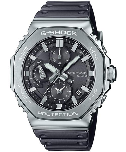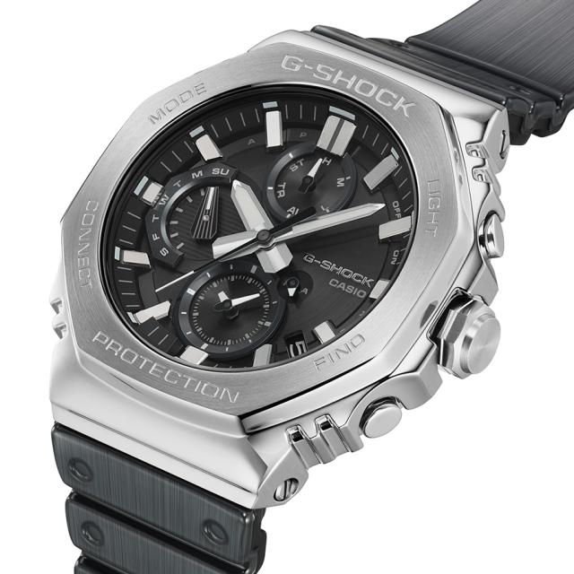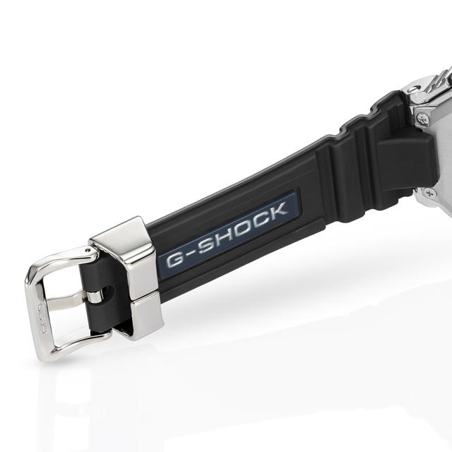 ケース、ベゼルにステンレススチールを採 用しながら、1983年に誕生したDW-5000Cにも採用された八角形のベゼル形状を継承しています。ベゼルとケースの間に、ファインレジン製の緩衝材を実装することで、メタル外装による耐衝撃構造を可能にしています。