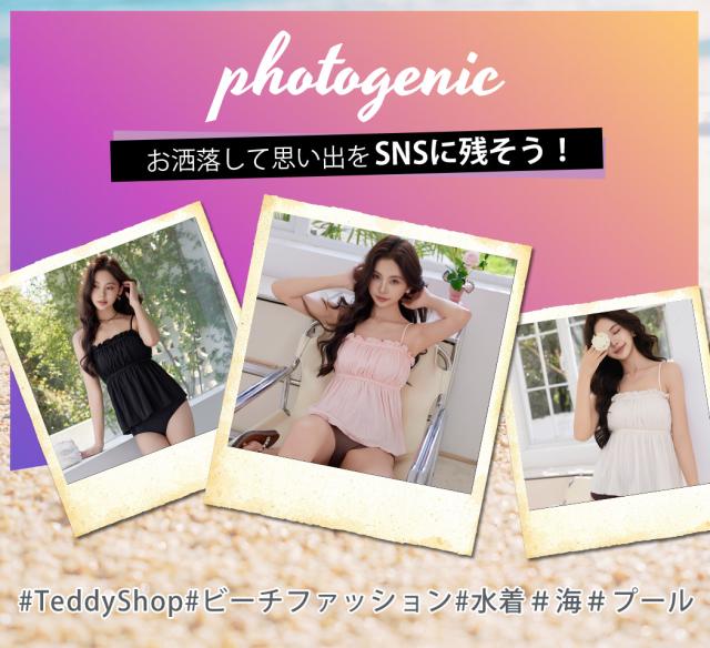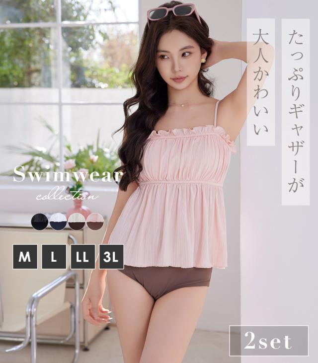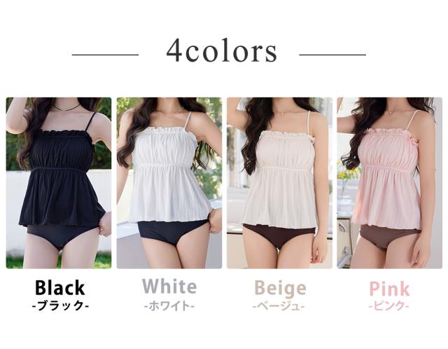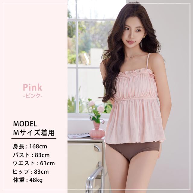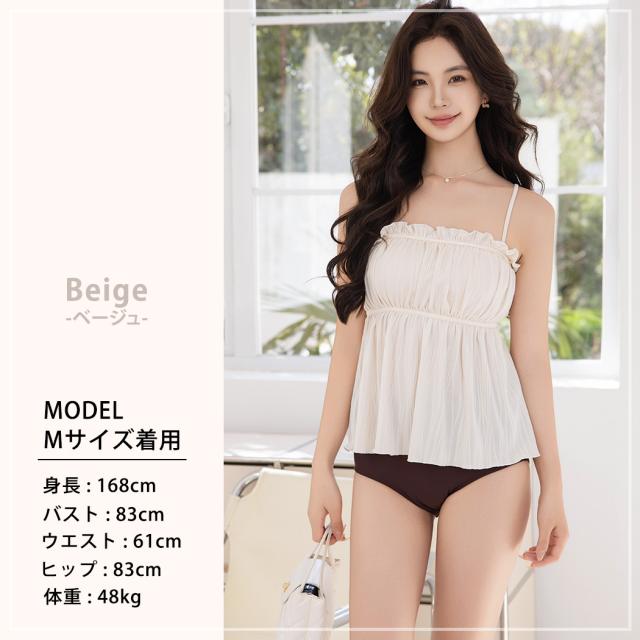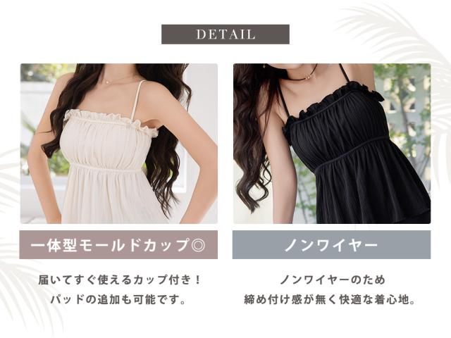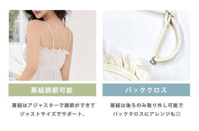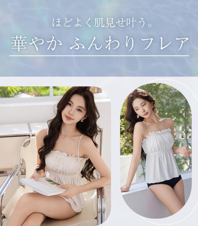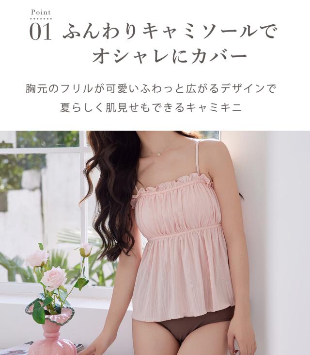 胸元のフリルが可愛いふわっと広がるデザインで夏らしく肌見せもできるキャミキニ