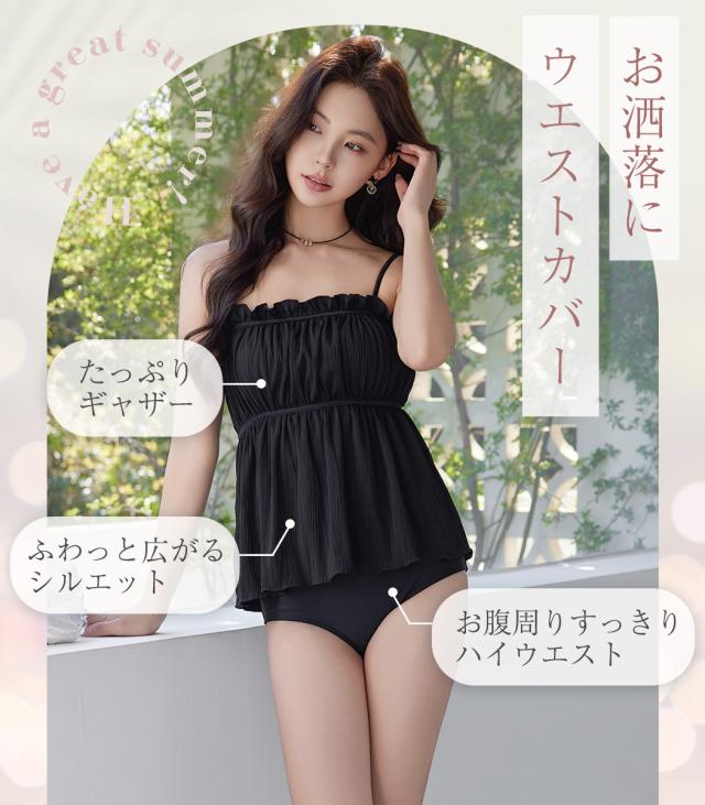 ビキニ 水着 レディース 2点セット セパレート キャミキニ ビスチェ キャミソール フレア フリル ギャザー ハイウエスト ショーツ 異素材MIX スクエアネック ノンワイヤー ストラップ 調節可能 バッククロス ウエスト カバーアップ 黒 白 海