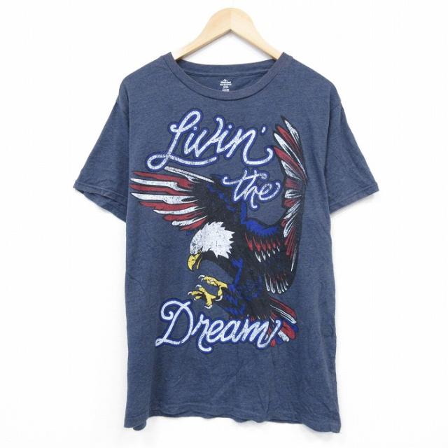 【商品名】 L★古着 半袖 Tシャツ メンズ 鳥 クルーネック 紺 霜降り