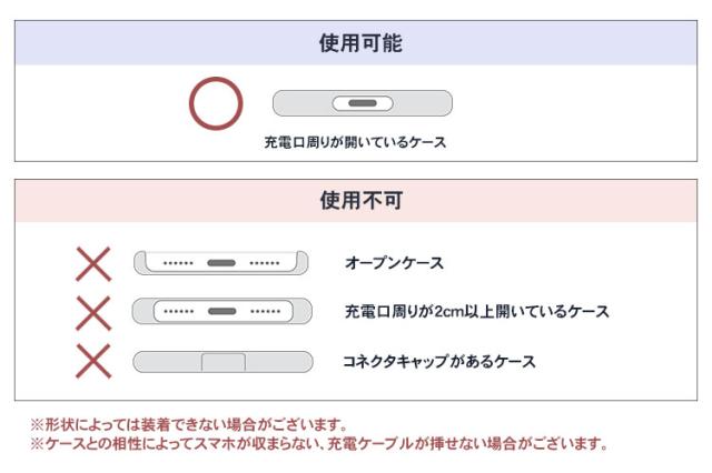 ※スマホケースとの相性によりスマホが収まらない、充電ケーブルがさせない場合がございます。