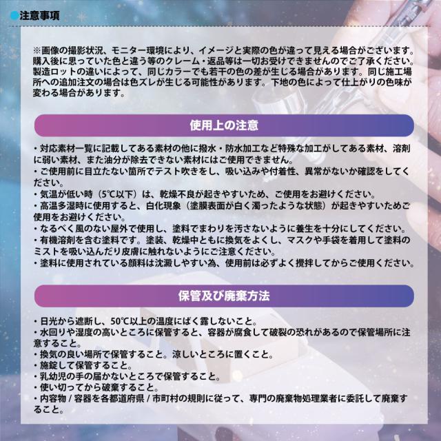 ・有機溶剤を含む塗料です。塗装・乾燥中ともに換気をよくし、マスクや手袋を着用して塗料のミストを吸い込んだり皮膚に触れないようにご注意ください。