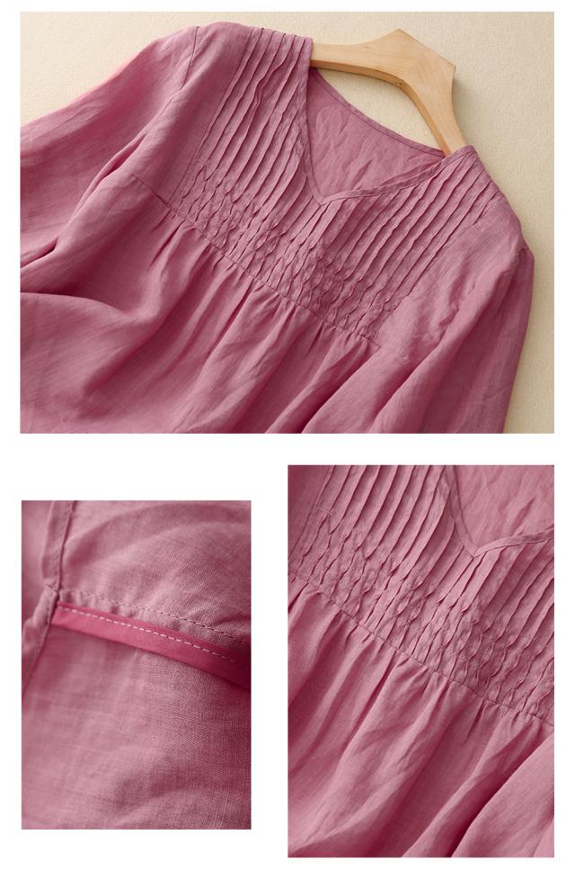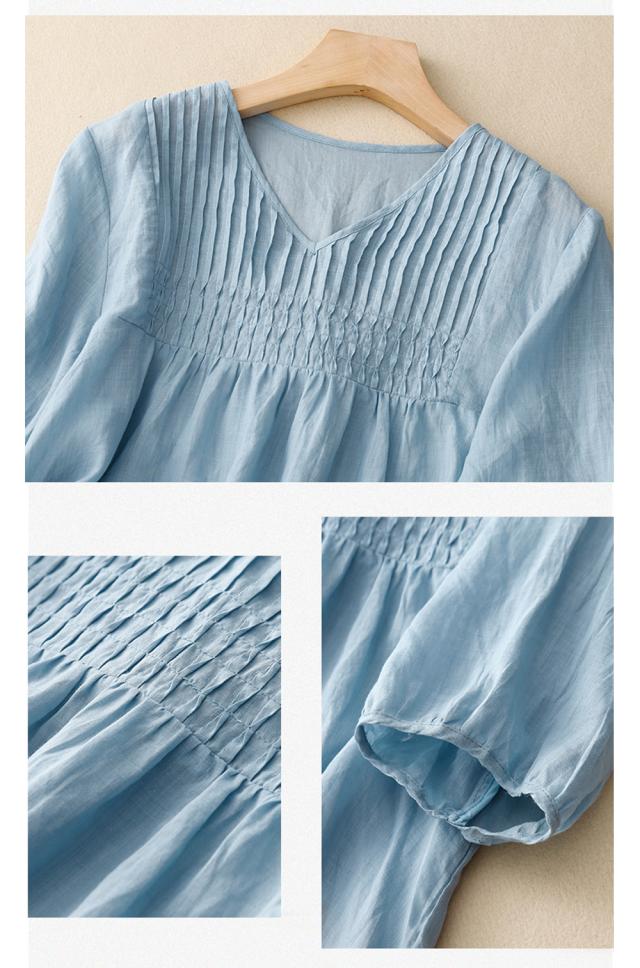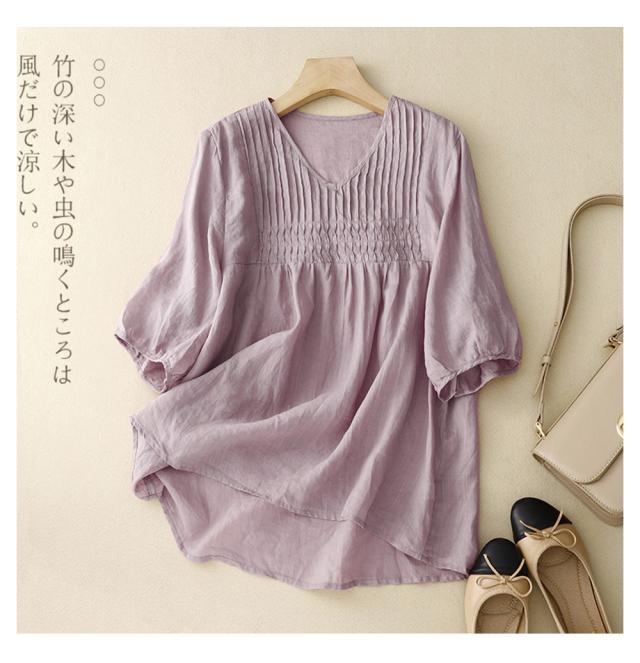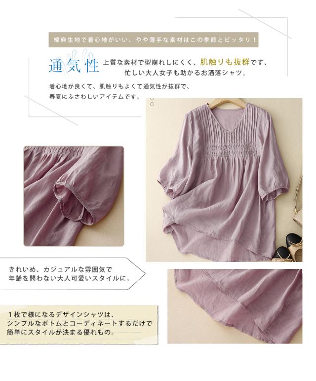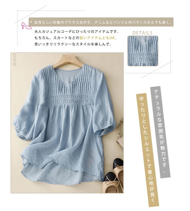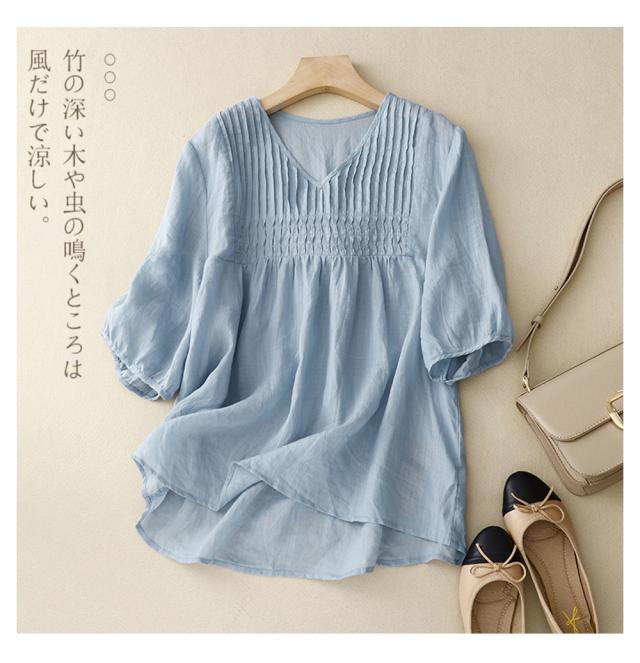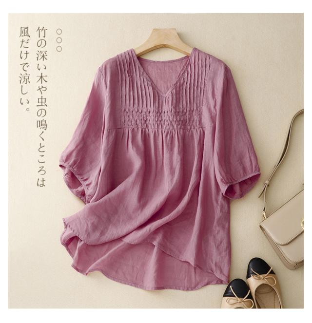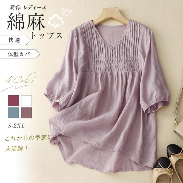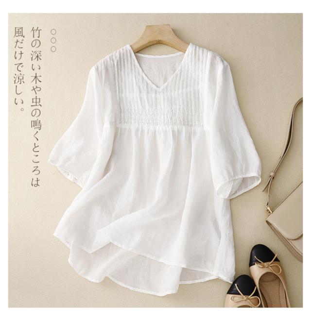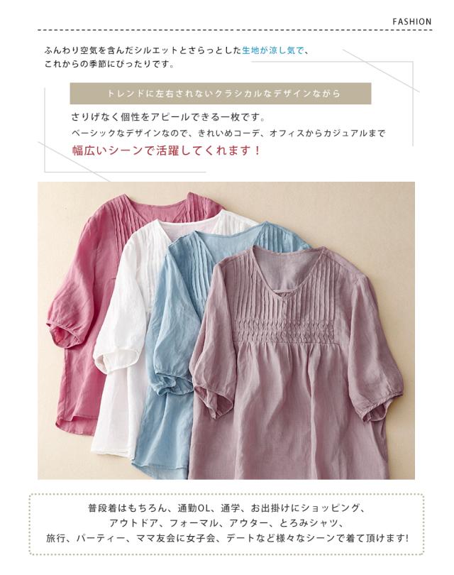 リネンシャツ レディース 半袖 ブラウス vネック tシャツ カットソー 綿麻 プルオーバー Aライン ゆったり カジュアル 薄手 通気 通勤 普段着