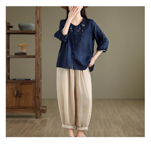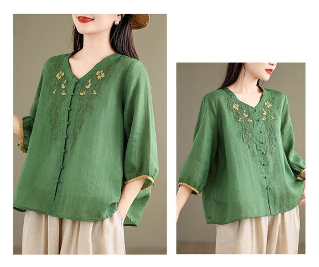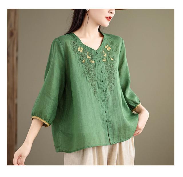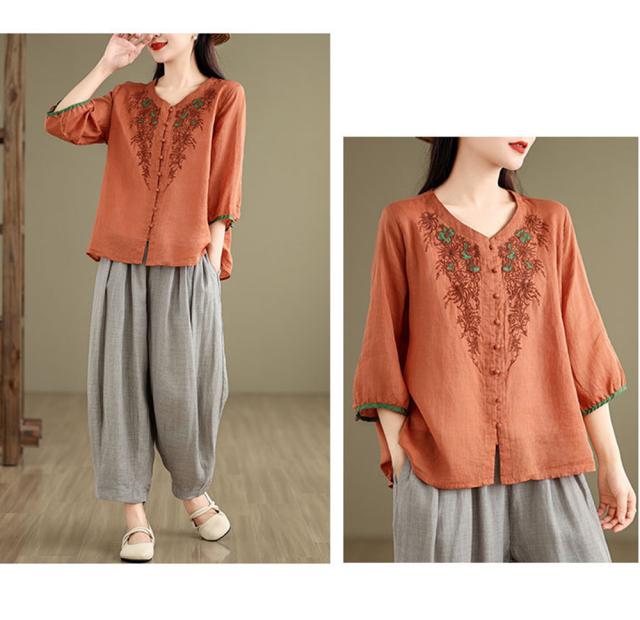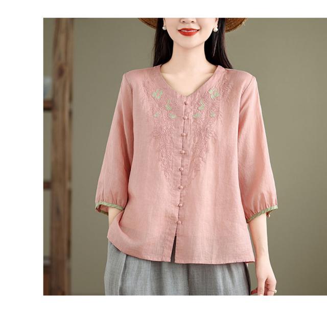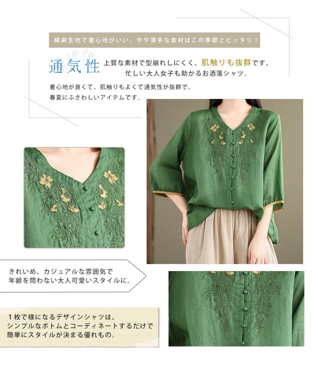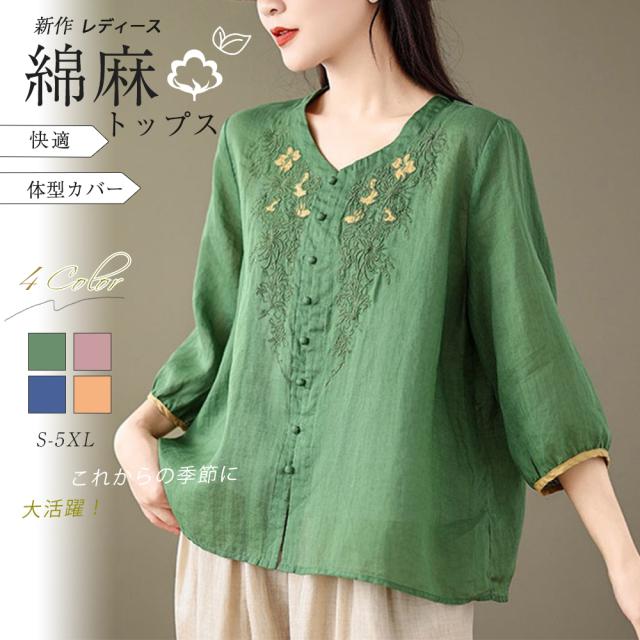 ブラウス レディース トップス 刺繍ブラウス綿麻Tシャツ 花柄 シャツ 女性 リネン シャツ 夏 五分袖 上着 ゆったり おしゃれ シンプル カジュアル プレゼント