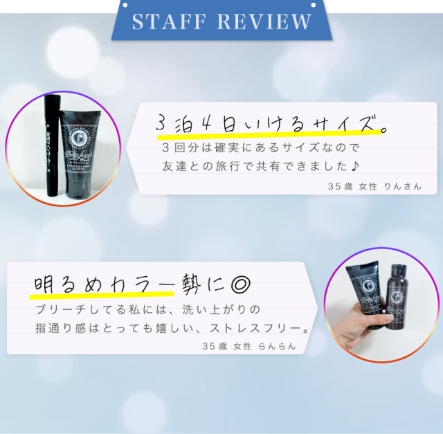 ●トリートメント:シャンプー後、軽く水気を取り適量を髪全体になじませたあとすすぎます。
