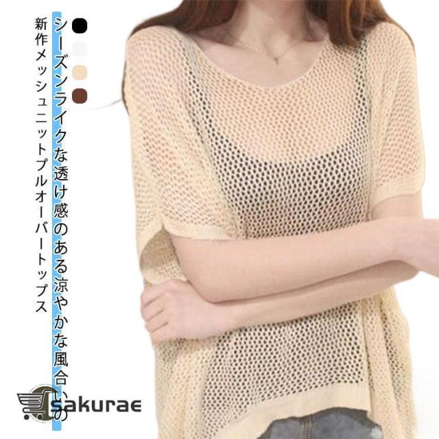 ニット ドルマン 夏 半袖 ニットトップス レディース 春夏 サマーニット 日焼け防止 涼しい 薄手 透かし編み メッシュ 透け感 おしゃれ ゆったり