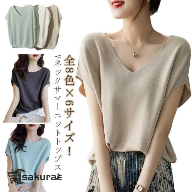 レディース トップス Vネック シャリ感リブニット ニット 薄手 夏 半袖 無地 半袖 ノースリーブ レディース 秋 サマーニット セーター 無地 半