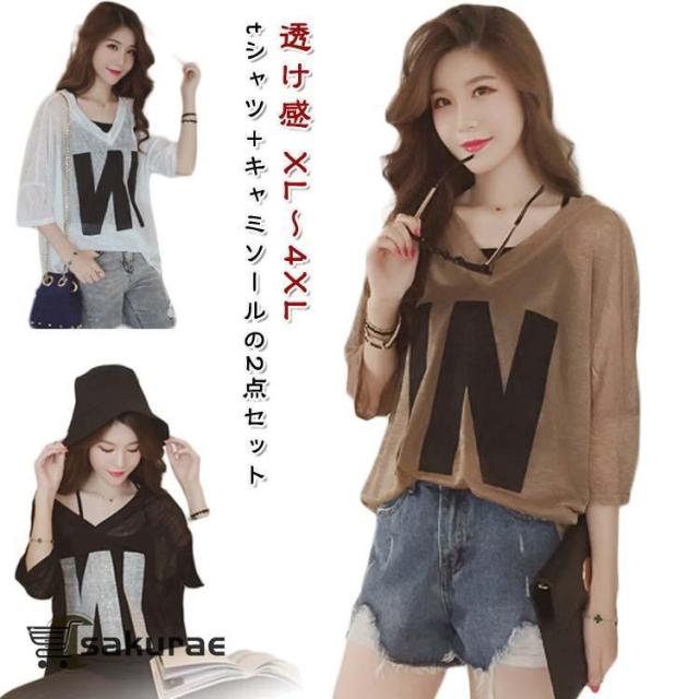 シアートップス 重ね着 シアートップス 透け感 tシャツ キャミソール 着〓せ 長袖 Vネック 2点セット インナー付き レイヤード ゆったり 体型カ