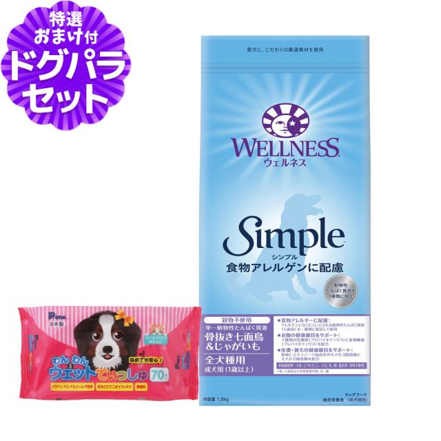 【沖縄以外送料無料】ウェルネス シンプル 全犬種用 成犬用 (1歳以上) 骨抜き七面鳥&じゃがいも 1.8kg+わんわんウエットてぃっしゅ 1個